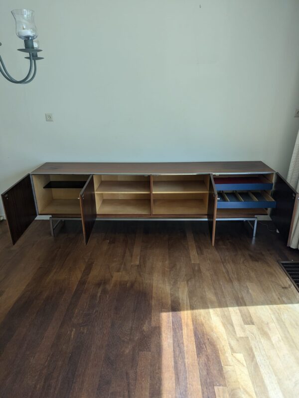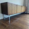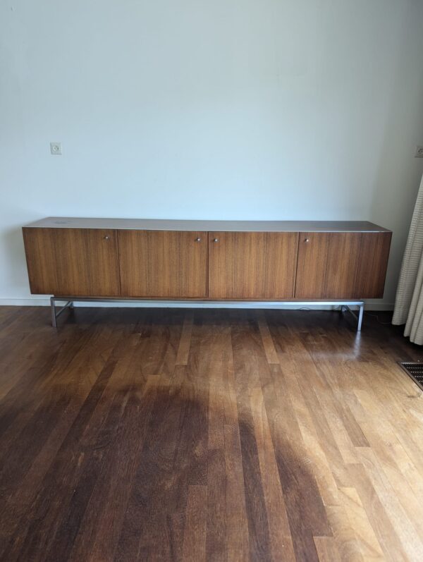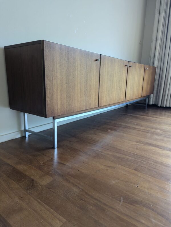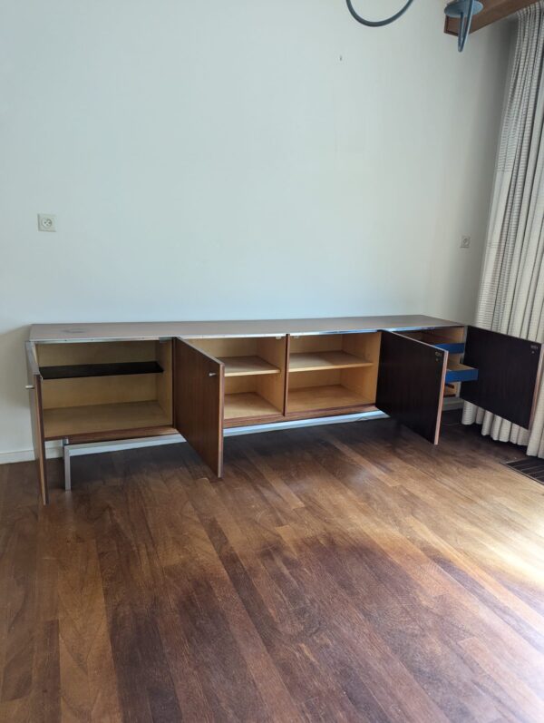 Fristho maakte meubels die exclusief waren, verfijnd en met een rijk materiaalgebruik. Dit dressoir valt op door de mooie palissander houtnerf structuur, de metalen strip langs de rand van het bovenblad, het mooie minimalistische (verchroomde) onderstel en de breedte van 243 cm.
