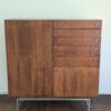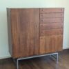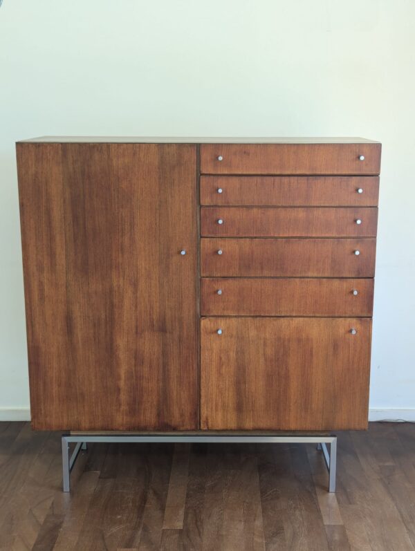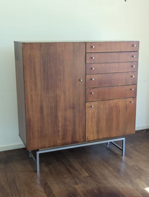 Deze grote kast, ontworpen door Günther en Brechtmann voor Fristho in 1961, heeft een strak en minimalistisch design en is gemaakt van teakhout met een metalen verchroomde strip langs de bovenrand en een verchroomde onderkant en deurknoppen. De kast bestaat uit 5 lades en een klein opbergvakje rechts. Links bevindt zich een grote deur met daarachter 2 legplanken. Genoeg opbergruimte! De binnenkant is gemaakt van berken- en palissanderfineer.
